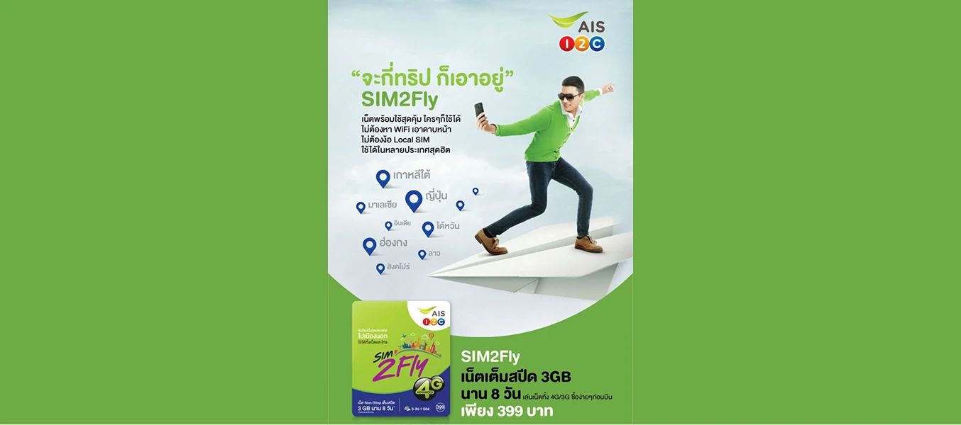 เอไอเอส เปิดตัว “SIM2FLY” ซิมโรมมิ่งรูปแบบใหม่ ที่รองรับการเดินทางถึง 8 ประเทศยอดนิยมในโซนเอเชีย ได้แก่ ญี่ปุ่น เกาหลีใต้ สิงคโปร์ ฮ่องกง ไต้หวัน ลาว มาเลเซีย และอินเดีย ด้วยราคาเริ่มต้น 399 บาท ทั้งนี้ ปัจจุบัน SIM2FLY ได้ขยาย การให้บริการครอบคลุมโซนยุโรปและอเมริการ และประเทศอื่นๆ อีกกว่า 50 ประเทศทั่วโลก